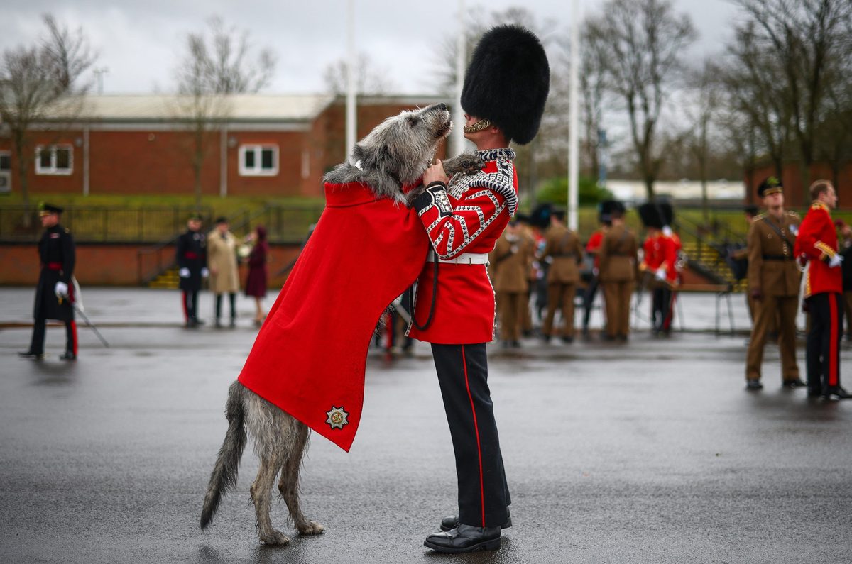 Main image: 3 year-old Irish Wolfhound Seamus, Irish Guards mascot, and his handler Drummer Ashley Dean following the Irish Guards Parade for St Patrick’s Day at Mons Barracks in Aldershot, south-west of London. (Credit: Henry Nicholls / Getty Images)