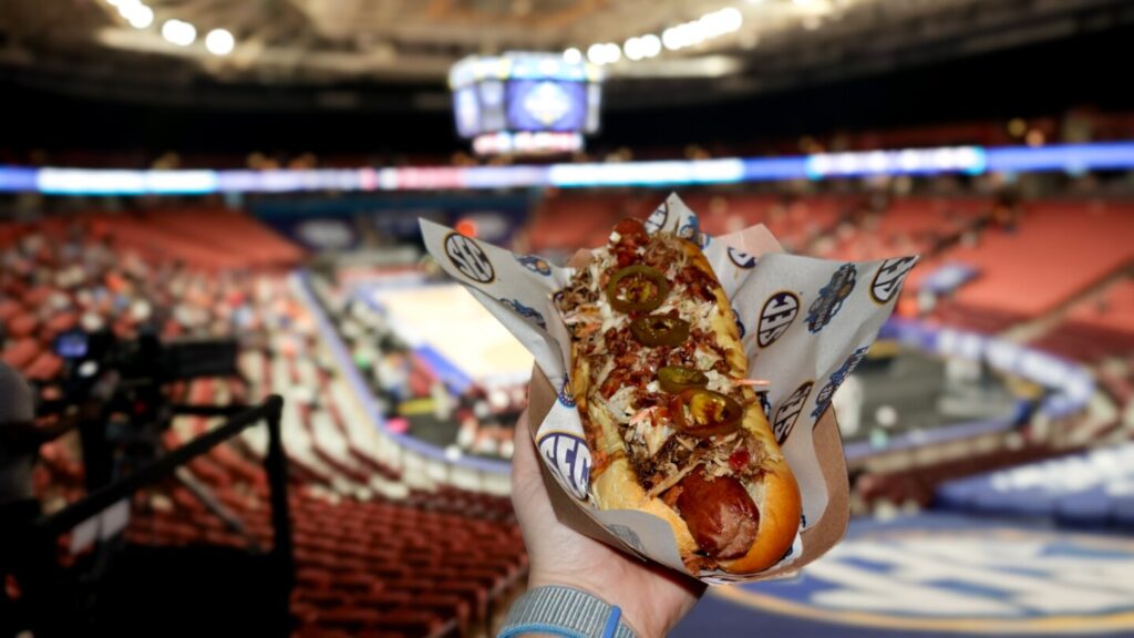 This cart on the concourse serves wild-topped hot dogs that change depending on the event. At the SEC Women’s Basketball tournament, we got a foot-long Razorback dog which had pulled pork, slaw, jalapeños, bacon, and a Dr. Pepper sauce.