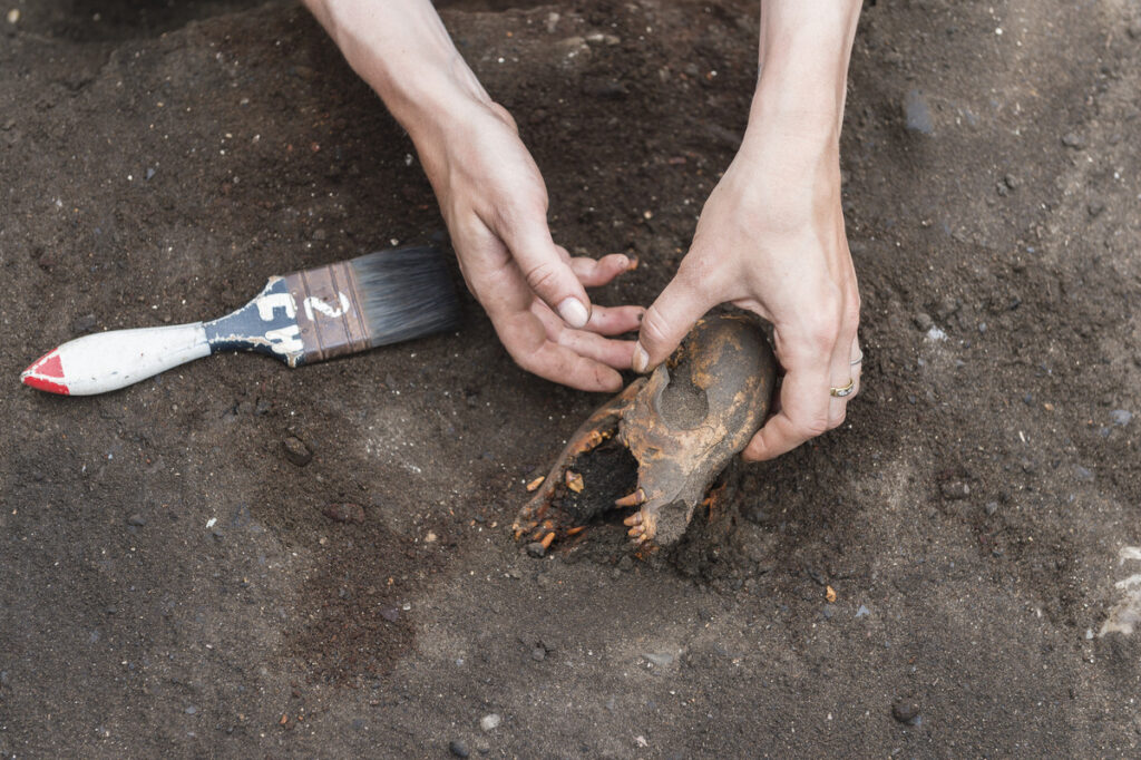 Removal of a dog skull from the Huaca Grande archaeological site, in Peru