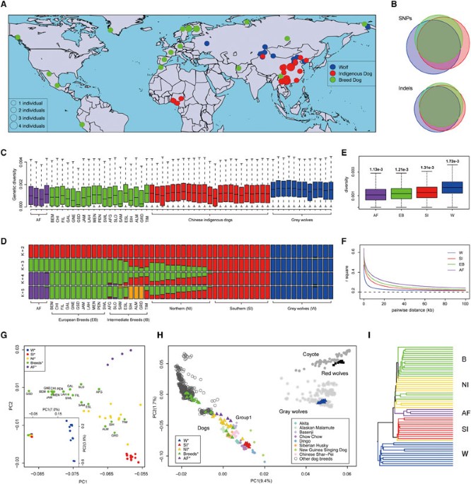 Population structure and genetic diversity of 58 canids. (A) Geographic locations of the 58 canids sequenced in this study. (B) Amount of of SNPs and small indels called in this study. (C) Genetic diversity for the 58 canids. AF, African village dogs; BEM, Belgian Malinois; CHI, Chihuahua; FIL, Finnish Lapphund; GAL, Galgo; GNE, Gray Norwegian Elkhound; GSD, German Shepherd Dog; JAM, Jamthund; LAH, Lapponian Herder; MEN, Mexican naked (hairless); PEN, Peruvian naked (hairless); SWL, Swedish Lapphund; AFG, Afghan Hound; SLO, Sloughi; SAM, Samoyed; ESL, East Siberian Laika; SIH, Siberian Husky; ALM, Alaska Malamute; GRD, Greenland dogs; TIM, Tibetian Mastiff. (D) Structure analysis of the 58 canids. (E) Genetic diversity of the different groups. AF, African village dogs; EB, European breeds; SI, southern Chinese indigenous dogs; W, wolves. (F) Linkage disequilibrium patterns for the different groups. (G) Principle component analysis of the 58 canids. Inset is for all individuals and the large panel is for dogs only. (H) Principle component plot for a large collection of canids together with our data. (I) A clock-like tree (UPGMA) for all the 58 individuals56.