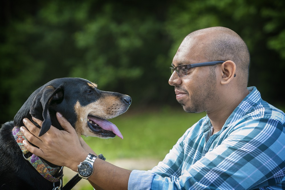 Dean Bobo, Bioinformatics Scientist, and Krishna Veermah, Assistant Professor of Ecology & Evolution. (F) Four-legged friend, Joci