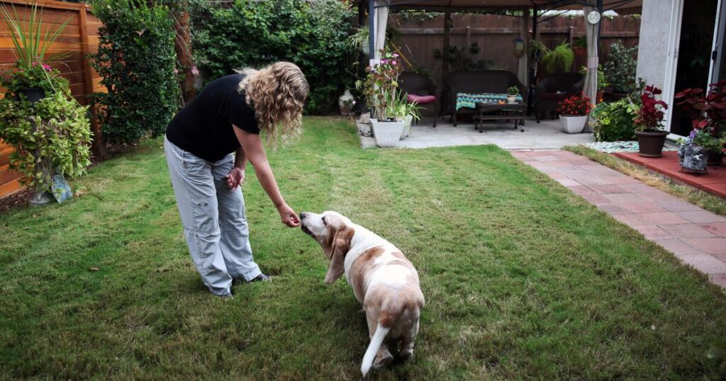 Andrea Cullipher, 48, a jewelry designer who lives in Burbank, gives her 10-year-old basset hound, Axel, Tessera Naturals CBD oil dropped on a piece of bread each morning to manage his degenerative joint pain. Despite taking medication for pain and inflammation, prescribed by a veterinarian, Axel’s tail still drooped, and he couldn’t walk more than a block without plopping down to rest.